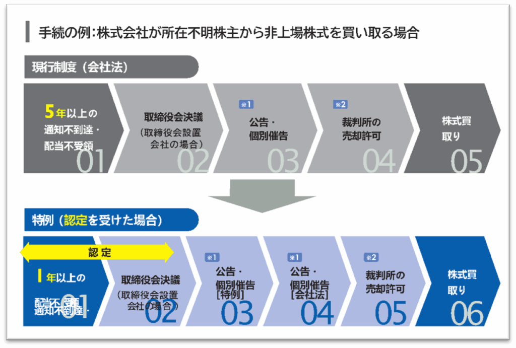 2021年の法改正により、事業承継ニーズの高い中小企業に限り、所在不明株主の株式処理に必要な期間が「5年」から「1年」に短縮される特例が創設されました。